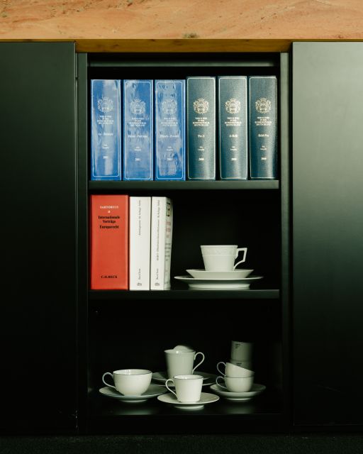 Dr. Thomas Puffe: The lawyer has opened his office cupboard for our client KPM - as a matter of course, there is KPM Berlin porcelain on the shelf next to the legal standard works.